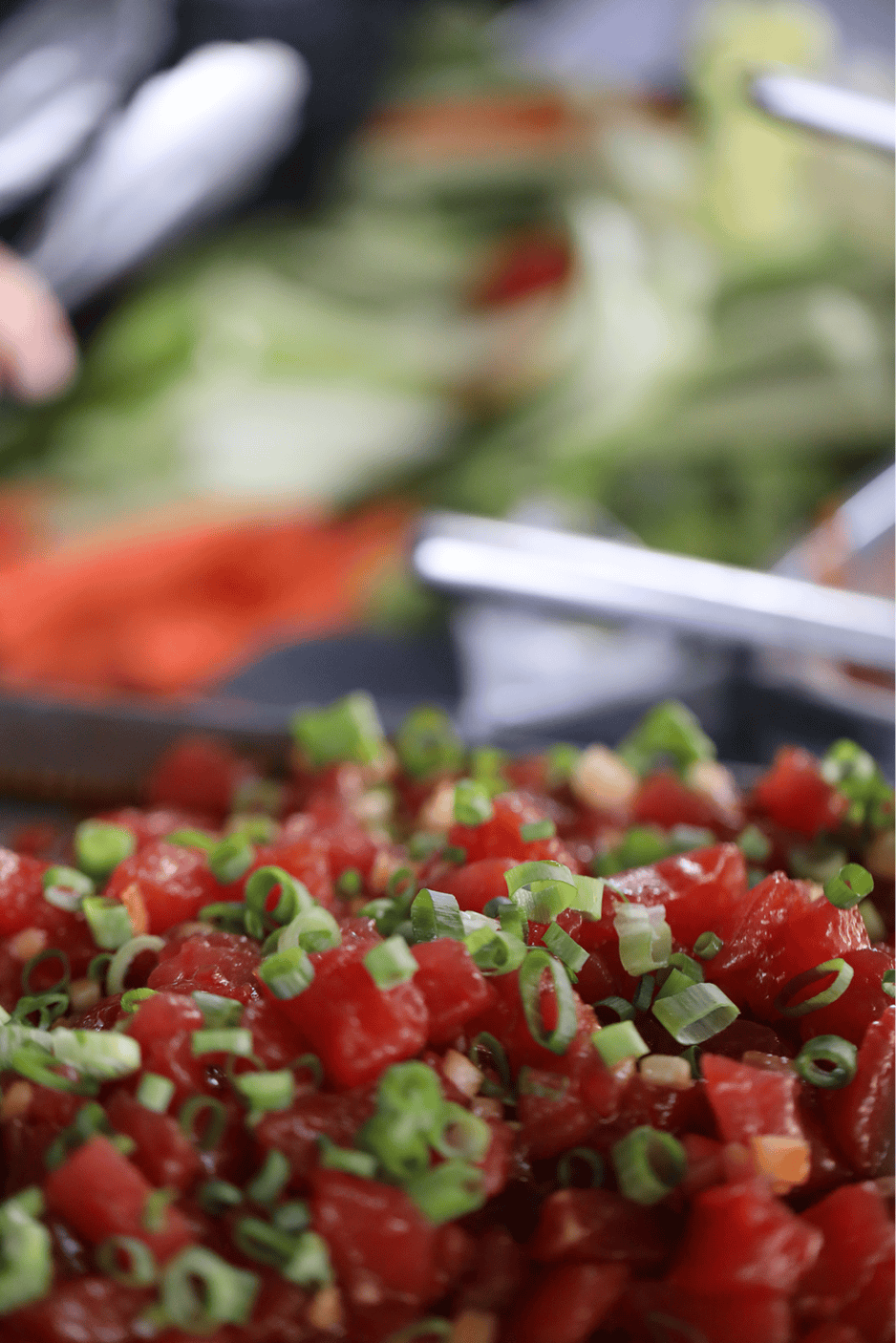 Salads & Starters: Waihee Mixed Greens with Papaya Seed Dressing & Lilikoi Balsamic Vinaigrette, Assorted Sushi, Hawaiian-Style Poke, Moloka‘i Sweet Potato Salad